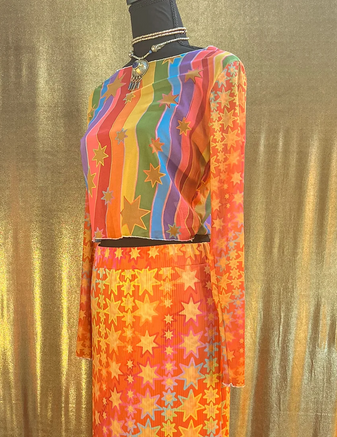 Bell Sleeve Top is a Mesh Fabric / Silky Skirt is a Ribbed Slinky Material With A Short Slit on the side
